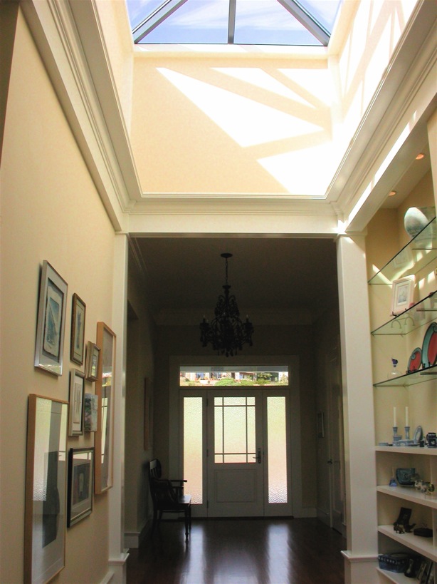 At the center of the house, right under the highest part of the simply shaped hip roof, we put a really large skylight and a light well with a molding line at the ceiling level of the rest of the main rooms. Thus, even though the house had to conform to severe height limitations on the outside, it seems very tall and spacious inside. The skylight is glazed clear and you can see the clouds go by overhead, so the visual space is really about 30,000 feet high.